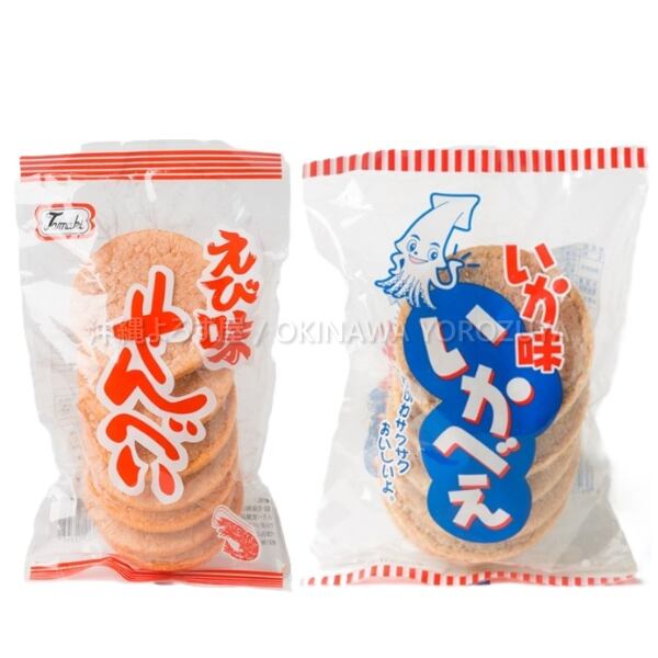 「沖縄よろず屋」がお届けする、沖縄の定番菓子「えび味せんべい」と「いか味いかべえ」の2種類セットです。